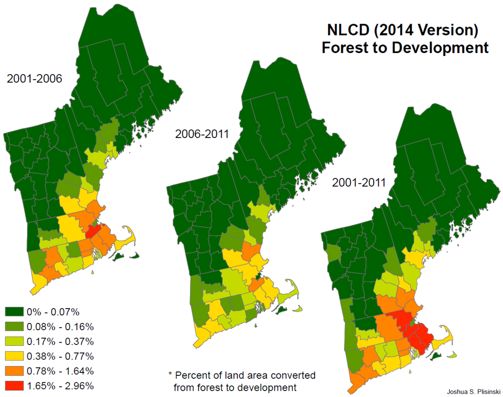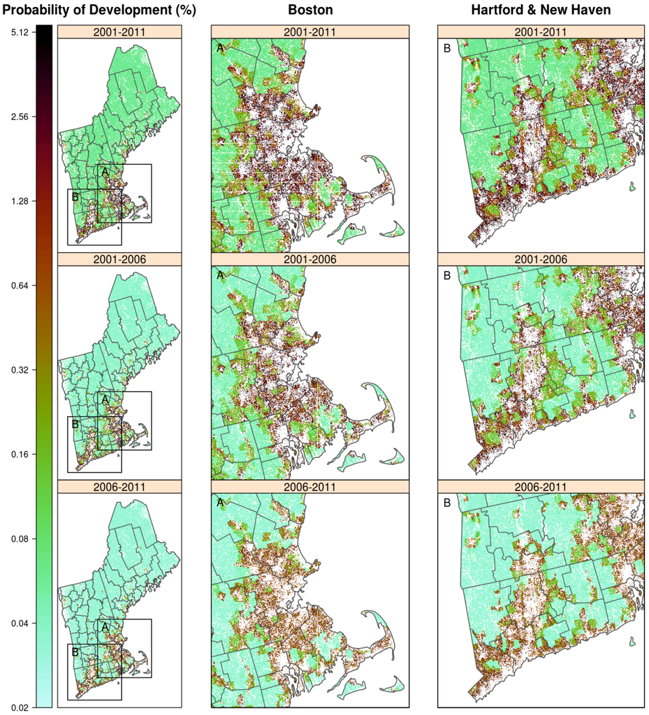 We are aware of no comprehensive high resolution analysis for predictors of development across the entire New England region. The research presented here assesses geographic variation in recent trends in forest loss across New England and quantifies the relative importance of multiple social and biophysical variables in predicting the conversion of forest to development. We assembled regional maps of possible predictor variables and used boosted regression trees (BRTs), a type of non-parametric model capable of capturing interactions and non-linear relationships, to quantify the strength of their association with forest conversion, based on land cover maps from the National Land Cover Database (NLCD) for 2001, 2006 and 2011. Using the BRT models, we produced high resolution (30 m) probability surfaces characterizing patterns of development over these time intervals. In addition to other considerations, our analysis inspects the relative importance of population growth as a predictor of development in the region.