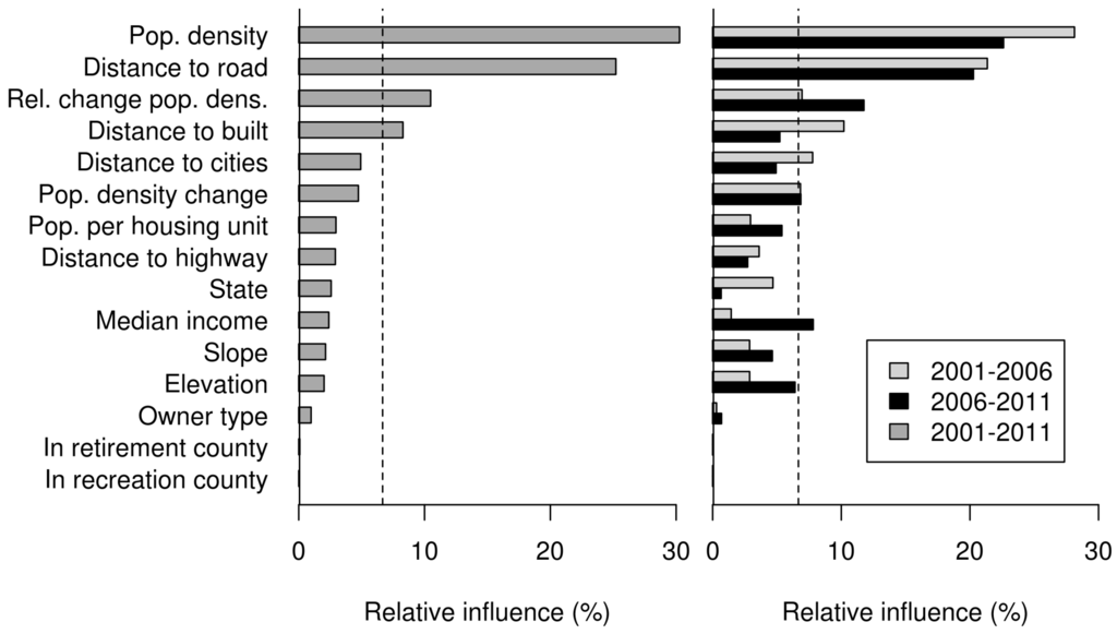 The library gbm reports the relative influence of each predictor variable, regardless of whether the relationship between predictor and response variables is positive, negative or positive for some values and negative for others. For all time intervals, the two most important predictive variables by relative influence in the BRTs were “population density” and “distance to road” (Figure 2). These two variables together explained 55.5% of the variation captured by the BRT for the full interval 2001–2011, 49.4% of the variation captured by the BRT for 2001–2006 and 42.9% of the variation captured by the BRT for 2006–2011. The other variables with predictive power above chance were “relative change in population density” for all intervals, “distance to built” for 2001–2006 and 2001–2011, “population density change” for 2001–2006 and 2006–2011, “distance to cities” for 2001–2006 and “median income” for 2006–2011. Relative change in population density was the third most important variable for 2001–2011 and 2006–2011, while “distance to built” was the third most important variable for 2001–2006.