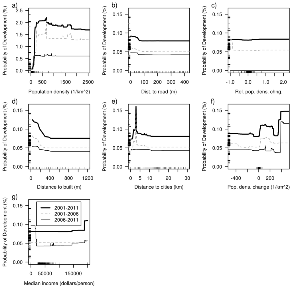 Partial dependency plots of the predicted probability of development with variation in the most important independent variables for BRT models for the full time interval 2001–2011 (thick black) and the two subintervals 2001–2006 (dashed gray) and 2006–2011 (thin black). Plots are shown for (a) population density, (b) distance to road, (c) relative change in population density, (d) distance to built, (e) distance to cities, (f) population density change and (g) median income. Rug plots are included on both axes in each plot to show percentiles within the data space for each time interval. X-axis rugs show the distribution of values in the driving variable, and y-axis rugs show the distribution of predicted probabilities for each time interval, using the same style as the graph lines for each interval. Where the percentiles were the same for both time intervals, the rugs overlap. Plots depict only the ranges of the independent variables over which the probability of development showed variation, while percentiles were calculated for the full range of the dataset. Note the greater y-axis range for (a) than for the other plots.