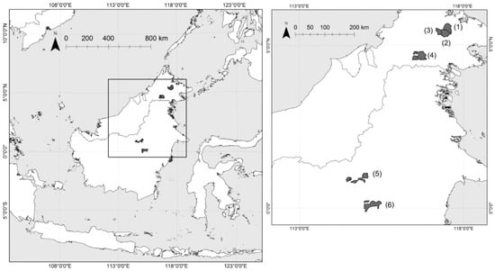Locations of the six forest management units (FMUs) in this study: (1) Segaliud Lokan, (2) Deramakot, (3) Tangkulap, (4) Sapulut, (5) Roda Mas, and (6) Ratah.