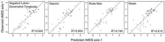 The cross validation indicated that the accuracy of the model estimates varied among FMUs but was generally high. The means (95% confidence interval, CI) of the iteratively calculated correlation coefficients between the estimated nMDS axis-1 scores and actual observed scores (adjusted R2 values) were 0.57 (CI 0.10–0.87), 0.54 (CI 0.10–0.87), 0.69 (CI 0.37–0.91), and 0.56 (CI 0.12–0.84) for Segaliud Lokan-Deramakot-Tangkulap, Sapulut, Roda Mas, and Ratah, respectively.