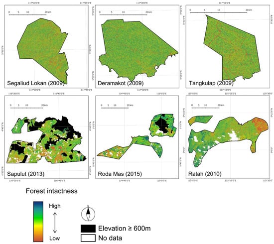 Several FMUs had areas of intact forests (e.g., along the left side in Ratah and upper-right side in Roda Mas). A few of the FMUs had conspicuous red-yellow areas, which corresponded to highly degraded areas. The most conspicuous red-yellow area was the eastern part of Ratah, which corresponded to the land after forest fire in 1998. The red-yellow area at western part of Roda Mas was allocated to local people who practice slash and burn agriculture. Mosaics of red areas occurred in Sapulut, which corresponded to industrial tree plantations. The forest intactness inside the Deramakot was uniformly green, reflecting the history of reduced-impact logging and longer cutting cycle (i.e., 40 years). In contrast, Segaliud Lokan where reduced-impact logging had been implemented after 2002 and Tangkulap where all logging activities had remained suspended after 2002 had sparse yellow-red areas inside. This indicated that the negative effect of high-impact conventional logging continued until 2002 still remained in these two FMUs.