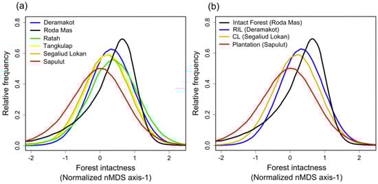 The histograms of the nMDS axis-1 scores in six FMUs are shown in Figure 4a. The histograms varied significantly among the FMUs in terms of mode and pattern; the ranges were the same because the nMDS axis-1 scores were standardized across the FMUs. The mode of Roda Mas had the highest axis-1 score among the FMUs, indicating that relatively intact forests occur over a disproportionately greater area in Roda Mas. At the same time, the density of low nMDS axis-1 scores (nMDS axis-1 score = −1) was also nominal in Roda Mas, indicating the occurrence of current logging activities with reduced-impact logging techniques. The mode in Deramakot, the model site of sustainable forest management in Sabah, had the second highest score among the FMUs. The nMDS axis-1 scores of the modes among four representative FMUs were decreased in the order reflecting their logging intensity, history or management (Figure 4b).