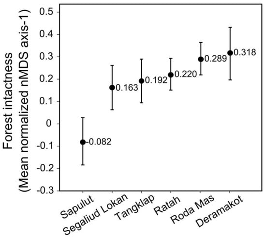 The mean values and 95% confidence intervals of the nMDS axis-1 scores are shown in Figure 5, in which the six FMUs are arranged in increasing order of their mean nMDS axis-1 score. Deramakot, which has been designated as a model of sustainable forest management by the Sabah Government, recorded the highest mean score, 0.318 (CI 0.197–0.432). The second-highest score was 0.289 (CI 0.219–0.365) in Roda Mas. The scores were 0.220 (CI 0.151–0.293) in Ratah. Tangkulap and Segaliud Lokan, where high-impact conventional logging continued until 2002, had relatively low scores of 0.192 (CI 0.094–0.290) and 0.163 (CI 0.063–0.262). Sapulut, where industrial tree plantations occur in approximately 35% of the area, recorded the lowest score of -0.082 (CI -0.184–0.027). Overall, the mean score of Sapulut (-0.082) was significantly lower than that of the other FMUs, while the other FMUs did not significantly differ from one another. There was well-defined variation in the mean score (0.192–0.318) among the FMUs that were certified by the FSC (Figure 5), although the 95% confidence intervals broadly overlapped with each other among the FMUs.