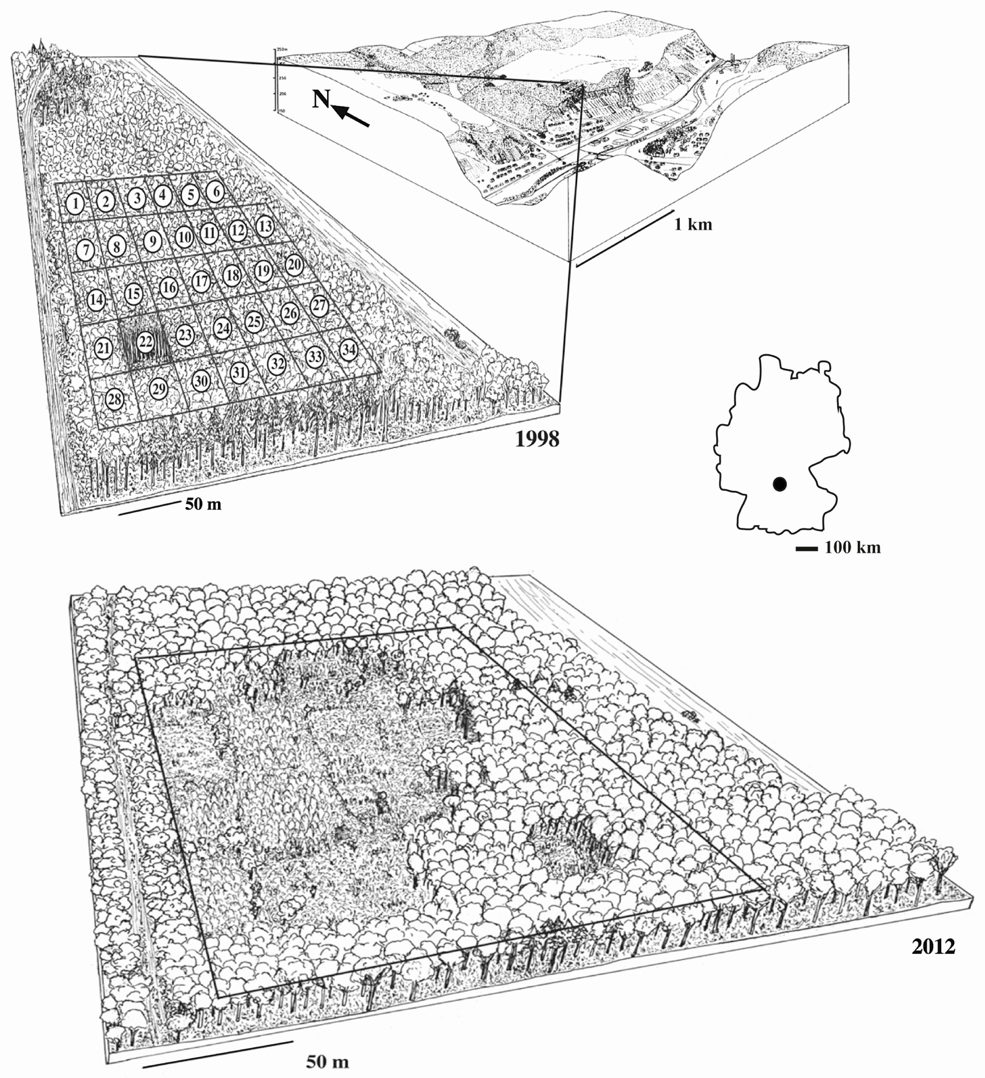 The regional setting of the experimental field in 1998 and 2012.