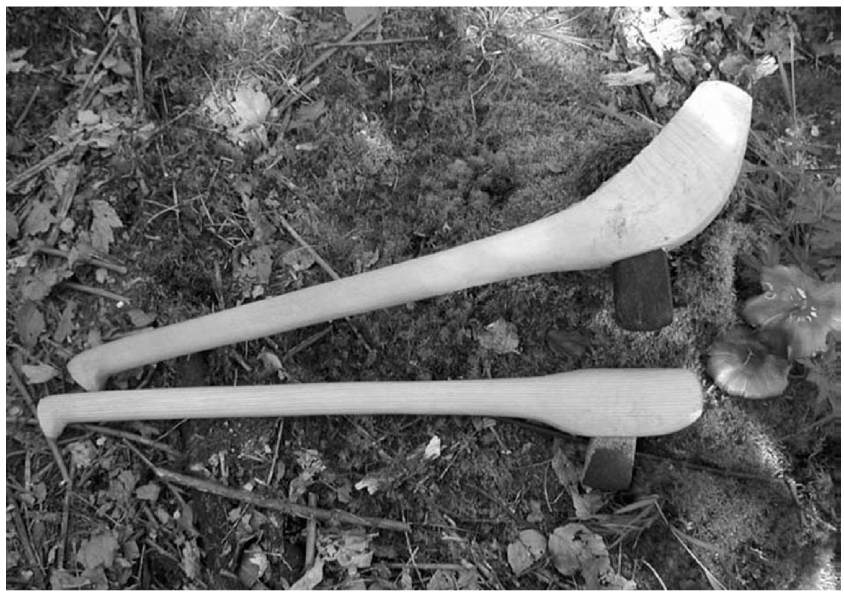 Functional replicas of Younger Neolithic stone axes shafted in straight and tangled shafts, produced by M. Kaiser, Freiburg.