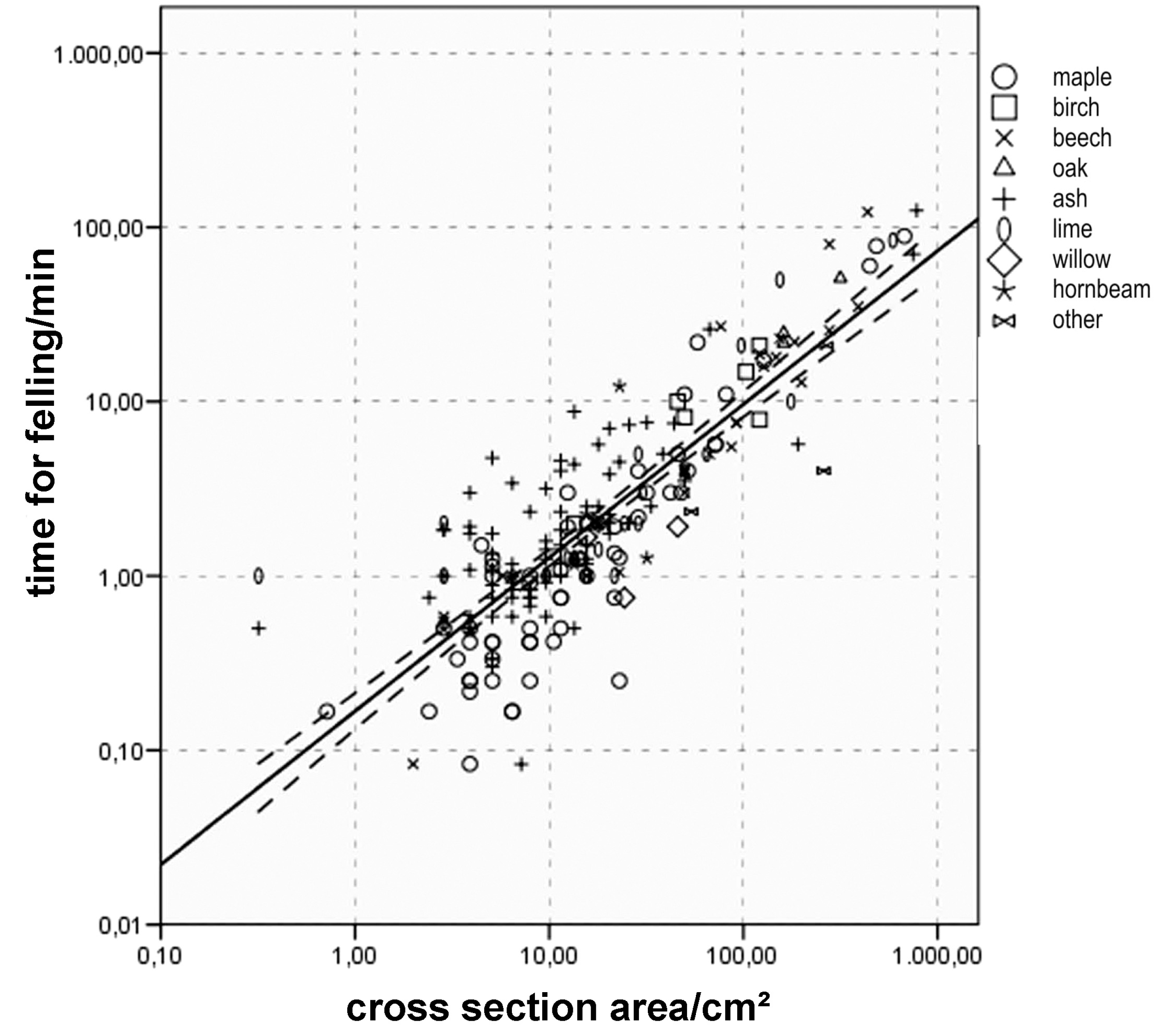 Regression diagram showing the time used for felling (x-axis, min) in relation to the cross section area of the trees (y-axis, cm²) and the tree species. Both scales are logarithmic.