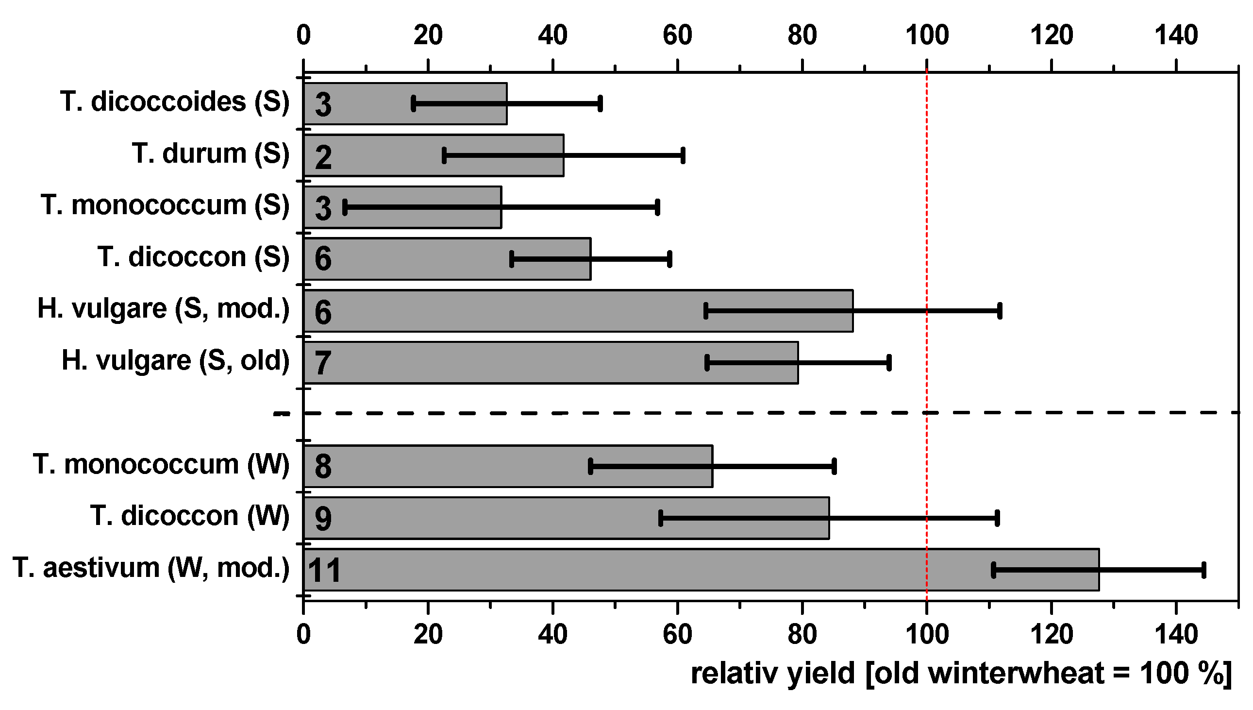 Autumn-sown crops have higher yields than spring-sown crops. The crop type also influences the yield (Figure 5): in comparison with the old Triticum aestivum race, taken as a reference, the winter crops Triticum monococcum and dicoccon showed 60% and 80% yields, respectively. Among spring crops, wild Triticum dicoccoides produced a yield of about 30%, T. monococcum, T. dicoccon, and T. durum produced a figure of 30%–40%, and Hordeum vulgare (old/modern) produced a yield of 75%–90%. The highest performance was recorded for the modern Triticum aestivum, which had a 28% higher yield than the old race.