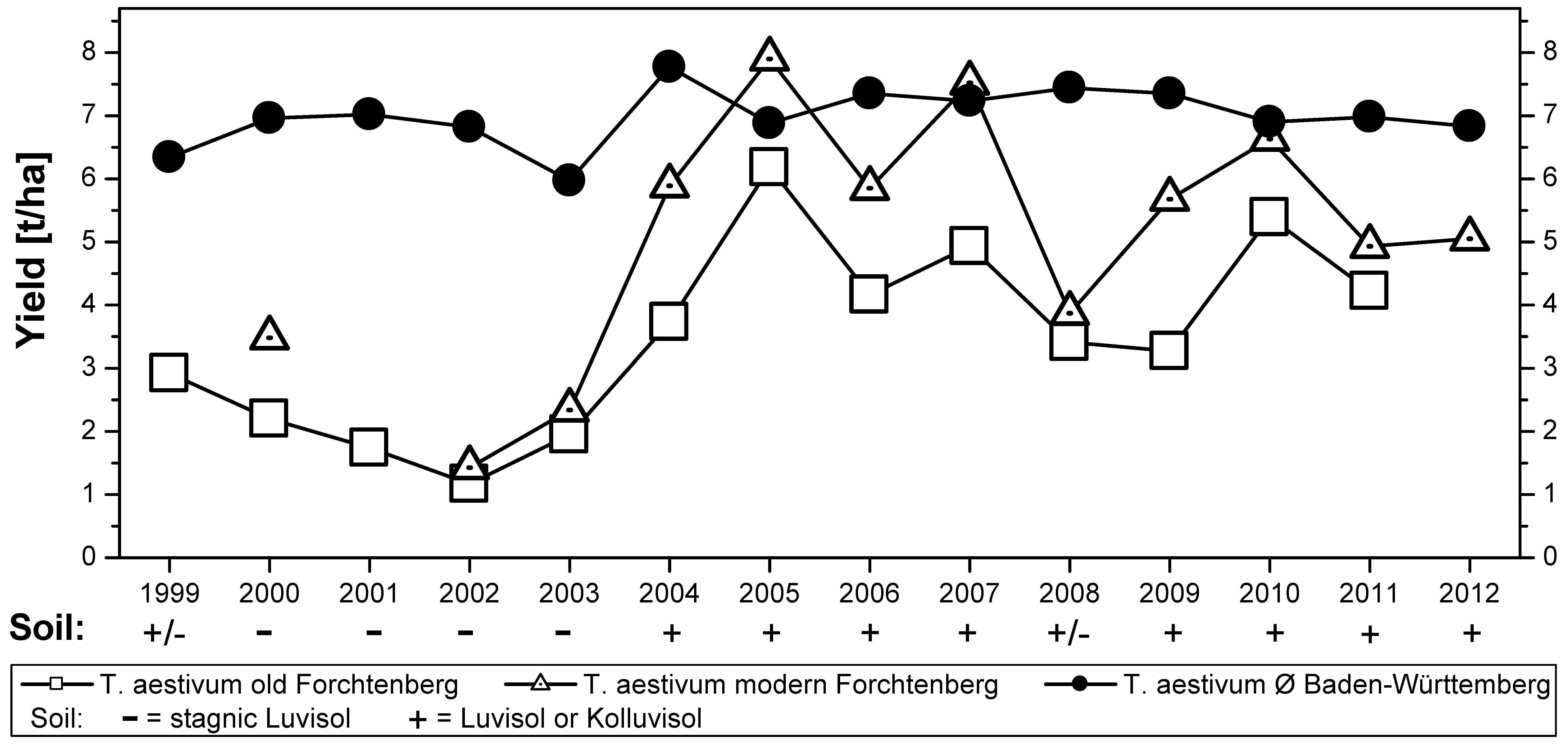 The Triticum aestivum yields after burning are compared with the average yields in Baden-Württemberg (Figure 6). Before 2003, experiments were on stagnic, and later, they were mostly on haplic Luvisols. Yields on stagnic Luvisols were distinctly lower. Experiments using haplic Luvisols reached, and sometimes exceeded, the average yields of modern agriculture in Baden-Württemberg.