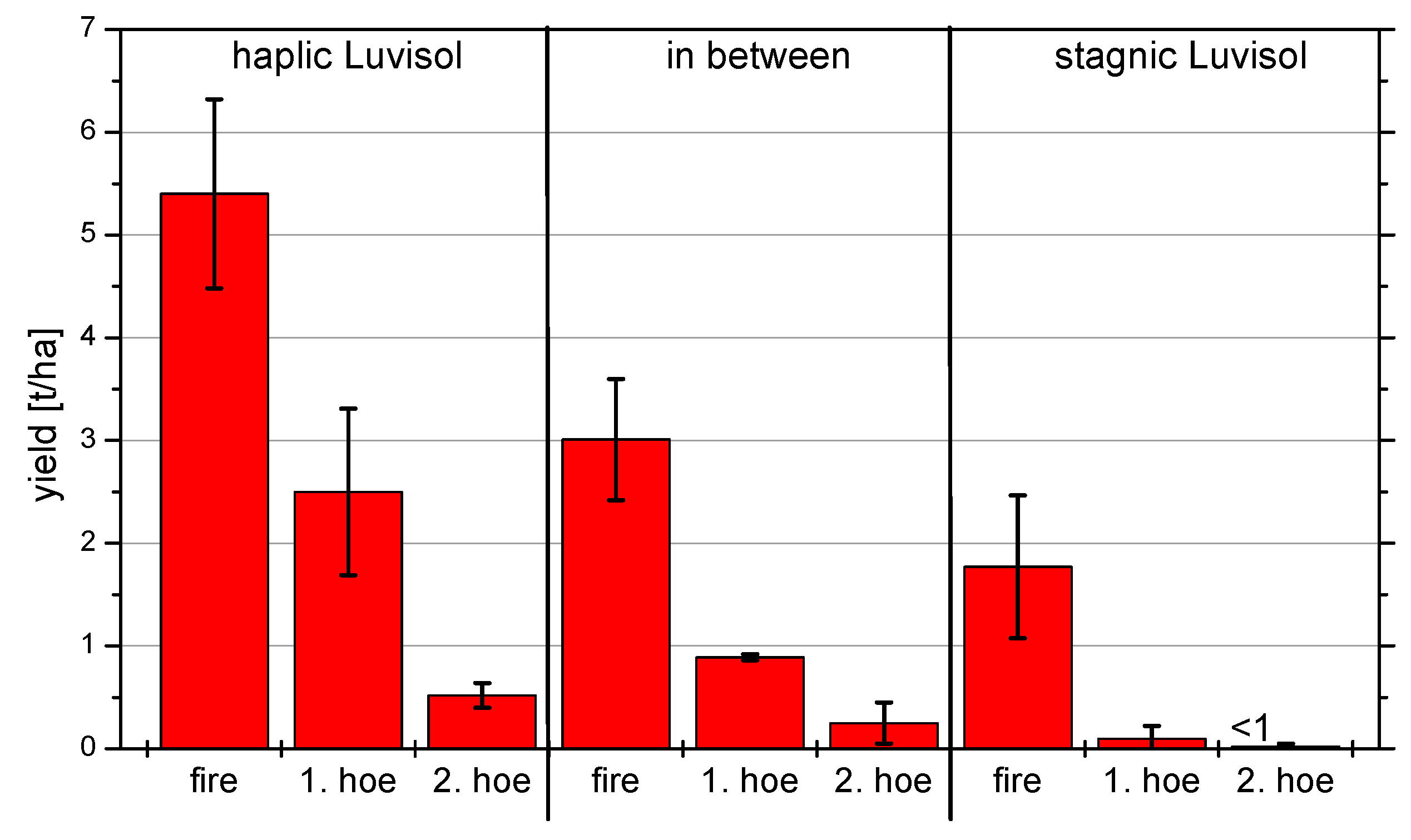 Crop yields. Mean values of Triticum aestivum (modern and old winter wheats) on different soils and with various cultivation methods (1998–2012) (Ehrmann, et al. [29]). Note: fire = first cultivation year after clearing and burning; 1. hoe = tillage, first cultivation year after clearing; 2. hoe = tillage, second and following cultivation years after clearing.