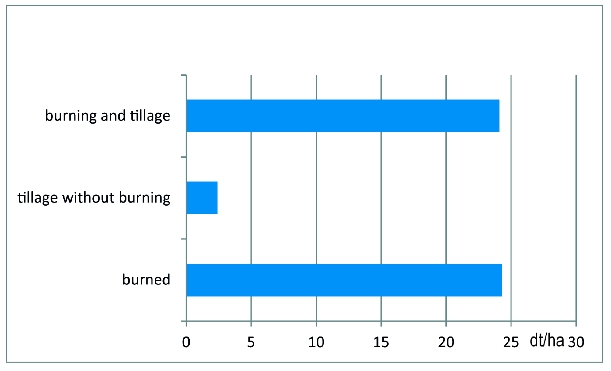 From the tropical rain forest of South America, a cultivation system combining burning, tillage, and the application of organic matter is known, resulting in a soil called terra preta (Glaser, et al. [31]). Similar methods cannot be excluded for the European Neolithic. To get more experience of such a system, a test combining fire and tillage was carried out in 2016. The experiment took place on a plot with poor soil that was first cleared and cultivated in 1994. Because of too much rain, 2016 was a very difficult year for agriculture in South-west Germany. The results are shown in Figure 8. The yield after tillage, without the use of fire, was typically low. The yield after burning was about 24dt/ha, which is not so bad for stagnic Luvisol during a very wet year. The yield after burning and subsequent hoeing was exactly the same. In this very wet year, we had severe problems with mildew for the first time. The crops on the burnt and hoed field looked better, but were more easily infested by mildew than the crops on the burnt-only field. Therefore, the yield is the same. In order to obtain clearer results, these experiments should be continued.