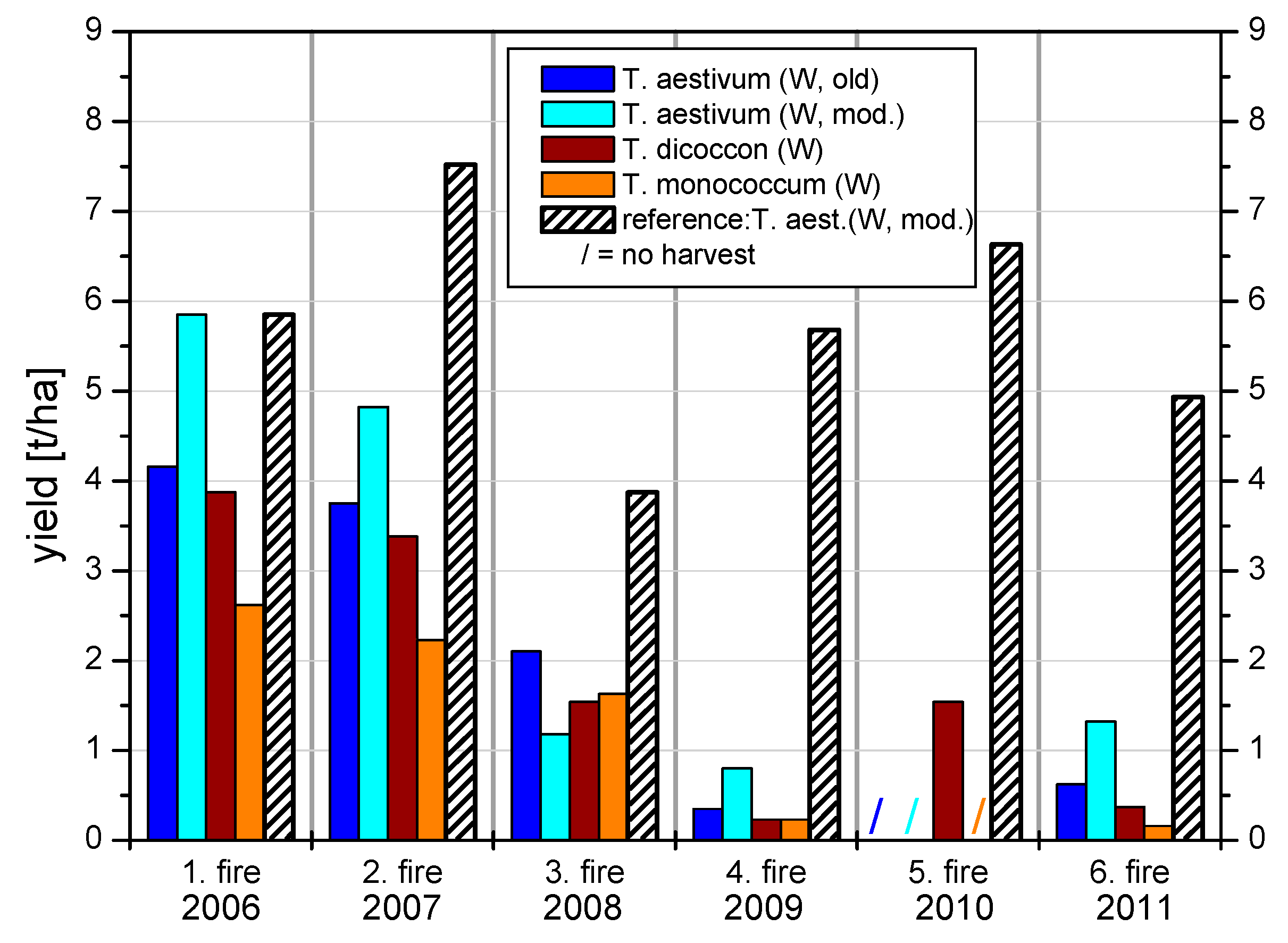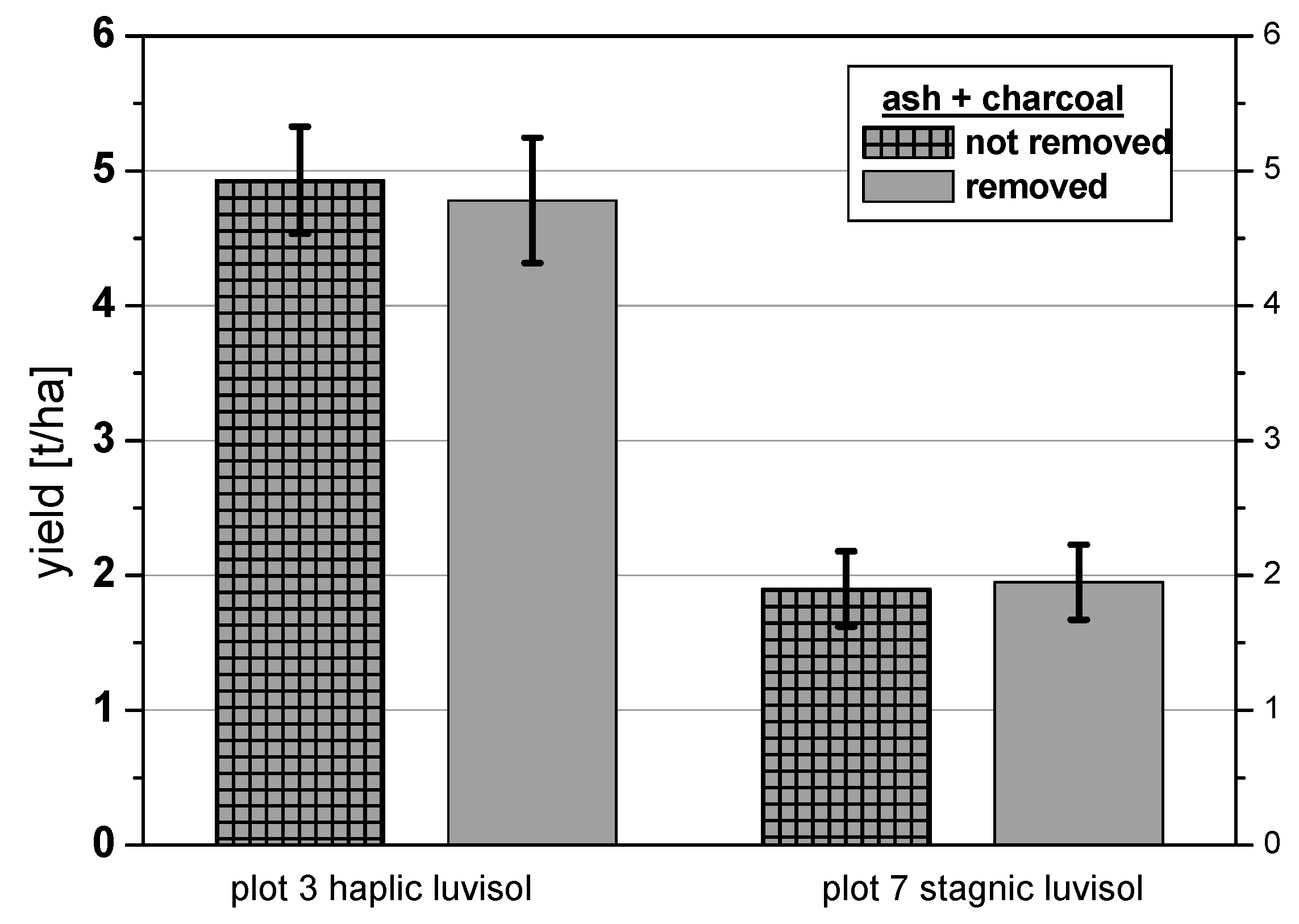 Crop yields (t/ha) of Triticum aestivum (winter wheat, modern variety), with and without removal of charcoal and ash (Ehrmann, et al. [29]).