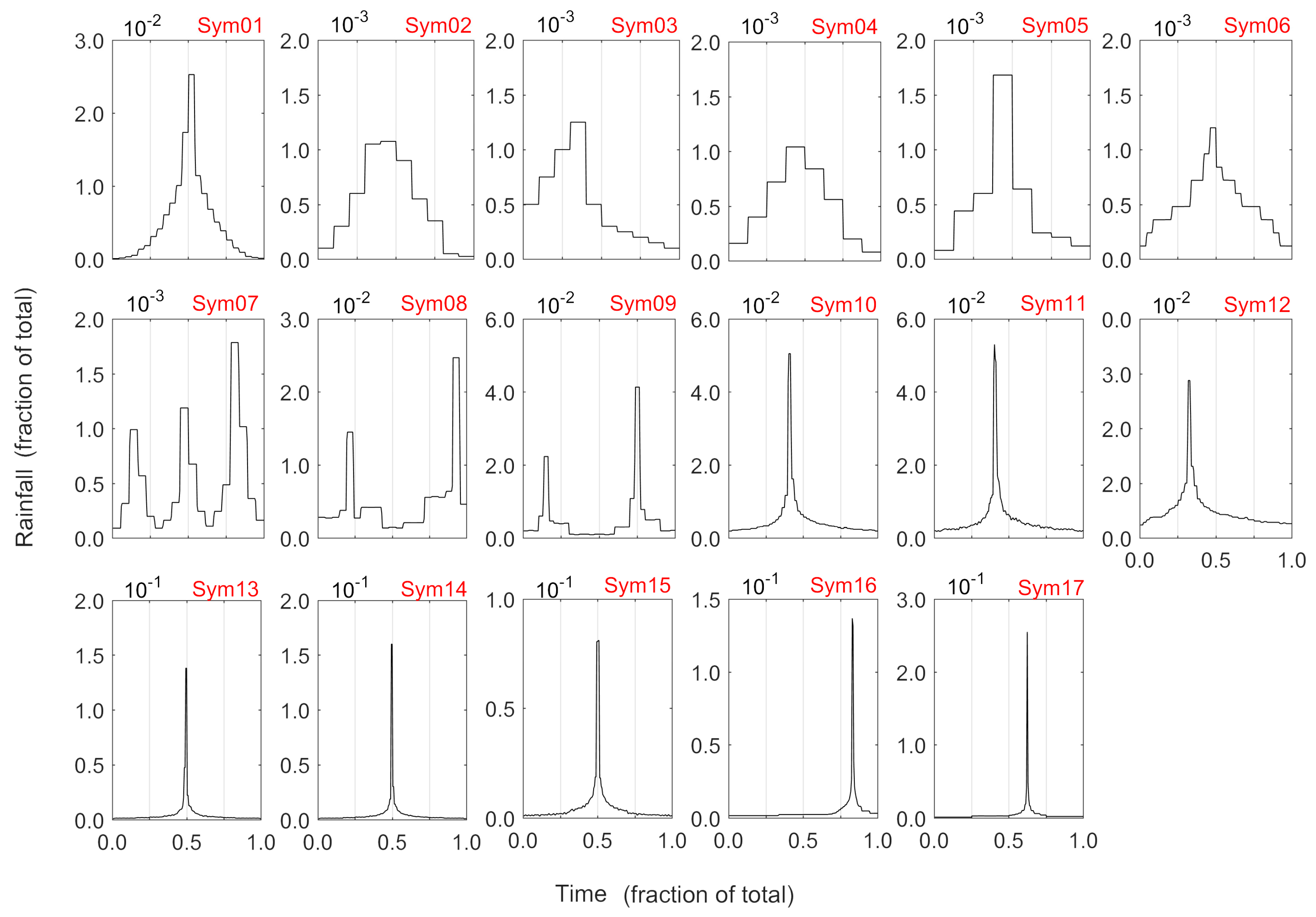 - the shape of the hyetograph defined as its “triangularity” (TRN). To this point, the triangularity is the ratio between the hyetograph area and the area of a triangle having as base the hyetograph duration, and as height, the height of the main rainfall burst. Values close to 1 would represent highly triangular hyetographs (e.g., Sym02 to Sym04), with rainfall having regular intensity, whereas values close to 0 would represent hyetographs whose peaks is an abrupt change in intensity (e.g., Sym10 to Sym17);