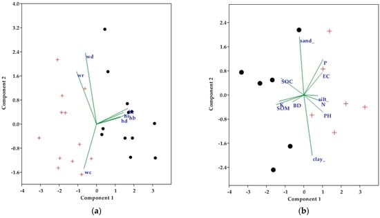 Principal component analysis correlation (% variance) diagram based on vegetation and soil physico-chemical attributes in Harishin rangelands of Ethiopia (open grazing area = filled plus shape; enclosure areas = dot shape ): (a) Vegetation attributes (hd = herbs diversity; hr = herbs richness; hb= herbs biomass; hc = herbs basal cover; wd = woody diversity; wr = woody richness; and wc = woody canopy cover); (b) Soil physico-chemical attributes (N = Nitrogen; P = Phosphorous; K = Potassium; SOM = Soil organic matter; SOC = Soil organic carbon; EC = Electric conductivity; BD= bulk density).