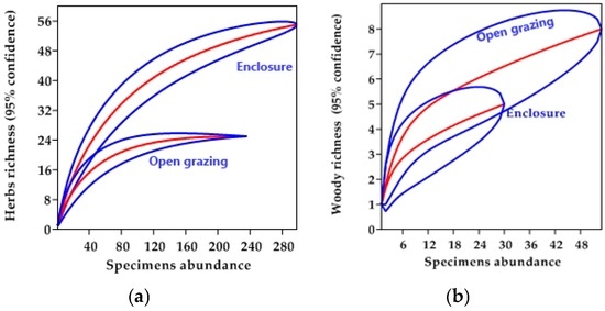 The species rarefaction curve of the species richness was found to be higher in the enclosure areas than in the open grazing areas. However, the trends of woody species richness were found to be greater in the open grazing than in the enclosure areas (Figure 3).