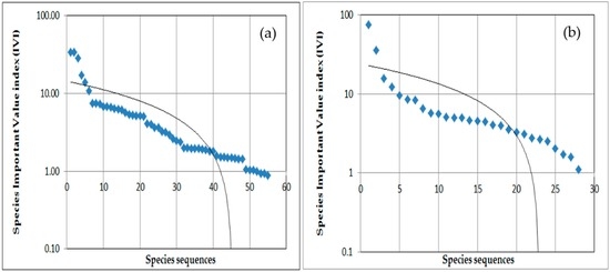 Herbaceous vegetation dominance–diversity curve based on IVI in Harishin rangelands of Ethiopia: (a) Communal open grazing areas; (b) Traditional private enclosure areas.