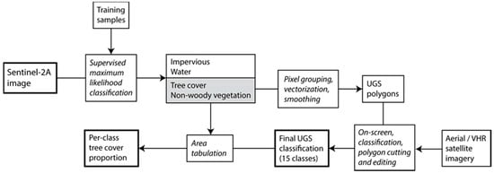 Since the proposed classification scheme of UGS is largely land use oriented, it is not viable to obtain the information by automatic methods. Therefore, aerial or very high resolution (VHR) satellite images are needed to perform on-screen interpretation and classification of individual UGS polygons extracted from the S2A data. Finer than 10 m spatial resolution imagery is useful also in the process of selecting the training samples for supervised automatic classification of the S2A imagery (Figure 1) [].