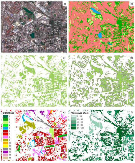 Six processing steps of the UGS extraction and classification (an example from study area Bratislava). (a) A true colour composite produced from S2A data; (b) result of the maximum likelihood supervised automatic classification; (c) binary map of vegetation/non-vegetation land cover; (d) vectorised and visually enhanced polygons with the minimum mapping unit of 500 m2 applied; (e) result of UGS visual interpretation and polygon editing; (f) tree cover share estimated using (b,e) on a per-polygon basis [].