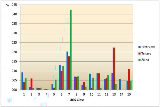 Proportion of UGS classes (%) in Bratislava, Trnava and Žilina.
