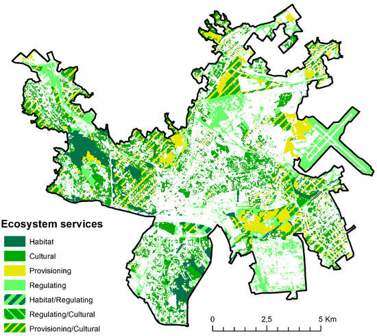 By definition, ecosystem services have societal relevance: they provide benefits that humans want or need. The Economics of Ecosystem Services and Biodiversity—TEEB Manual for Cities [] grouped ecosystem services in four major categories: provisioning, regulating, habitat and cultural and amenity services. In the process of spatial planning, all these desired outcomes must be identified and compared to the current potential of the UGS. Analyses and inter-city comparison of UGS patterns and their functions require not only detailed information on their relative quantity but also a closer examination of UGS in terms of quality and land use, which can be derived from the land cover composition and spatial structure.