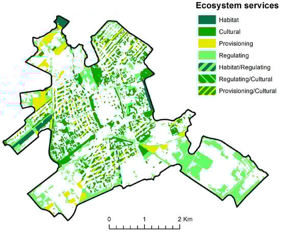 In Trnava, only limited amounts of the UGS correspond to urban forests or shore vegetation with the important habitat ecosystem services (ca. 5%). In Figure 7, areas with regulating ecosystem services dominate. In the city of Žilina (Figure 8), UGS with multifunctional ecosystem services cover the largest part of the territory.