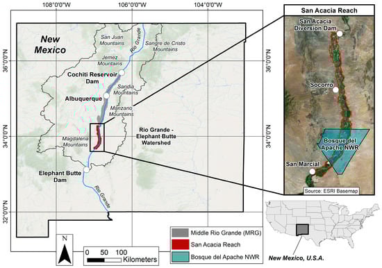 The research study area was the San Acacia Reach (SAR) of the Middle Rio Grande (MRG). The MRG is a 160-km portion of the Rio Grande in central New Mexico, stretching from Cochiti Reservoir (35°37′27″ N, 106°19′25″ W) to San Marcial (33°41′18″ N, 106°58′50″ W), and is considered to be one of the most extensive stretches of cottonwood–willow riparian forest remaining in the Southwestern USA []. The SAR, the southern portion of the MRG, stretches from the San Acacia Diversion Dam (34°15′20″ N, 106°53′14″ W), north of Socorro, to San Marcial, a length of roughly 65 km (Figure 1). The MRG is dependent on both summer monsoonal precipitation, which can be extreme but isolated and can provide large short-term river flows, and winter and spring storms from the Pacific Ocean, which provide snow for the surrounding high-elevation mountain ranges and result in more consistent and large spring and early summer river flows [,]. Climate variability can exist from season to season and year to year within the southwestern USA as a result of mid-latitude and subtropical atmospheric circulation regimes [].