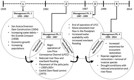 We reviewed the major coupled human and natural system interactions that have occurred within the SAR from 1935 to 2014, as well as the drivers of these interactions, in order to make interpretations and to try to better understand the spatio-temporal manifestations during each of the four specific management phases outlined in Figure 2 and discussed in detail below. This process was completed through a detailed evaluation of the temporal changes in large-scale management practices within the SAR and the distinct hydro-periods of fluctuating precipitation and river flow from 1935 to 2014. Due to the complex interactions of these human and natural agents, this mixed method review consisted of a qualitative literature review and an informal interview process, as well as a quantitative assessment of the natural river and climate dynamics [] to build a historical geography of the Rio Grande management activities and climate fluctuations [].