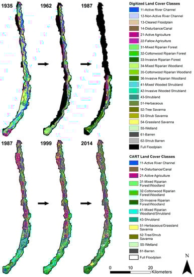 A land cover change analysis was applied to determine the overall spatial and compositional change of the vegetation and channel structure. Each digitized land cover map was converted to a 30-m raster format to match the Landsat classifications. Land cover maps were then aggregated by management phase (i.e., 1935–1962, 1962–1987, 1987–1999, and 1999–2014). Within the aggregation, only areas of spatial overlap between the combined years were assessed. Both the digitized and CART classifications were used for 1987 to match the other classification method for the specific management phase. Change data were derived to represent change across each phase and compared to expected land cover changes from the qualitative review of management impacts in order to derive interpretations about the observed relationships.