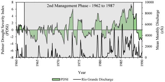 Monthly average Palmer Drought Severity Index (PDSI) data for New Mexico and mean monthly river discharge (cubic feet per second) for the second management phase (1962–1987) at the San Acacia Floodway gage located at the San Acacia Diversion Dam. Occasional flooding events led to periods of large river discharge (>2500 cfs). More consistent higher discharge rates align with above normal PDSI conditions beginning in the late 1970s.