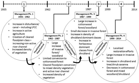 We identified four distinctive management phases as a means to isolate the effects of changing land use on the riparian vegetation. The following qualities were consistent for each phase: (1) begins and ends with a snapshot of the land cover structure and is defined by the aggregate land cover change across the entire multi-year phase; (2) aligns with major physical and/or structural changes within the reach, as well as climate fluctuations; and (3) highlights a shift in the mindset surrounding both the river and the bosque. Specific drivers are introduced for each phase as well as larger themes that are interconnected with the adjacent phases (Figure 2). Despite the unique drivers of each phase, there was a consistent requirement of water delivery for both human and agricultural uses throughout the full study period. This greatly influenced many of the management approaches used throughout the study period.