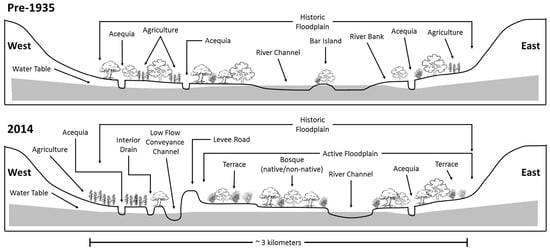 Many of the management practices assessed in this research were responsible for changing the physical structure within the system. Figure 6 shows a comparison between the generalized cross-sections of the pre-1935 and 2014 floodplains. The most significant change was in relation to the limitation of both the river channel and the extent of the active floodplain. With the construction of the LFCC, the active floodplain was limited to its boundary with the LFCC on the West and the upland areas on the East. This resulted in a more incised river channel with limited or no lateral movement, which influenced both the vegetation structure and composition. Similar structural controls are occurring or have occurred in many Southwestern river systems including the Santa Cruz and Colorado rivers in Arizona [,].