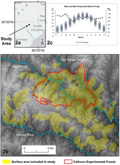 This investigation was conducted as part of the Calhoun Critical Zone Observatory (CCZO) project, a US NSF Division of Earth Sciences initiative to bring together a wide range of sciences on particular landscapes. The CCZO is an interdisciplinary research field site located on the Calhoun Experimental Forest, itself part of the Sumter National Forest, located in Union County, South Carolina (a 1336 km2 administrative unit). Our study area (roughly, 34°36′40″ N, 81°42′50″ W) encompasses the Calhoun Experimental Forest’s 2057 ha and adds an adjacent 14,143 ha of the surrounding Sumter National Forest for a total surface area of 16,200 ha (Figure 2). The study area is located in the Piedmont plateau physiographic region, bounded by the Appalachian Mountains to the west and the Atlantic Coastal Plain to the east. Topographically the study area is characterized by broad uplands at about 205 m above mean sea level (amsl) that drop steeply down slope into bottomland flood plains at about 95 m a.m.s.l. Current land cover is dominated by forests composed mainly of mixed pine-hardwoods and pine stands both planted and naturally regenerated. The area receives about 1180 mm of precipitation per year and temperatures typically range between −2.4 °C, (average minimum temperature for the coldest month) and 33.1 °C (average maximum temperature for the warmest month).