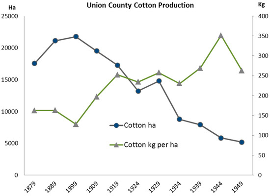 Cotton area planted (ha) and yield (kg per ha), Union County Agricultural Statistics, 1879–1949. Note: 1879–1889 were proportionally adjusted due to a change in county boundaries.