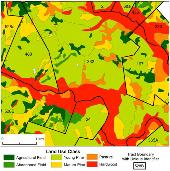 To understand the transition from plantation agriculture to a forest-dominated landscape, we analyze land use and tenure at the time the US government acquired the majority of what became Sumter National Forest, 1933–1941. Our investigation focused on two spatially and conceptually different units of analysis: property ownership or “tract” level and the land management level or “land use unit” (Figure 4). Land use units comprise a contiguous and bounded area of homogenous land use, for example an agricultural field or a woodlot [39]. Tracts are comprised of multiple land use units and constitute contiguous, legally bounded units of land ownership. Tracts are here assumed to be operationally equivalent to individual farms or plantations where landowners singly determine the number, nature, duration, and diversity of land tenure agreements. Land tenure agreements, in turn, define the possibilities and constraints within which individual farmers made their land use decisions.