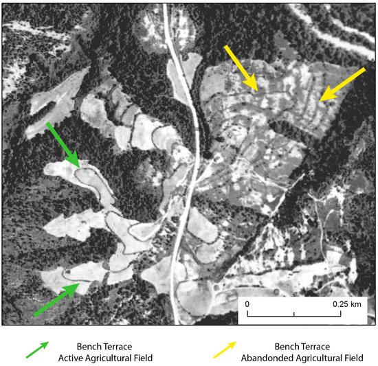 Investments in agricultural inputs and improvements such as the application of commercial fertilizers, [ditching, and terracing, in response to agriculturally induced erosion in the Piedmont began as early as the mid-1800s [37,54]. The wide bench terraces evident in a 1933 aerial photo of the Calhoun CZO (e.g., Figure 5) and noted in the US Forest Service economic valuation reports probably date from the 1890s onward [54]. These solutions were widely viewed as successful in the fight against erosion and, at least in our study area, there were few cultivated areas without such terraces by the Purchase Era.