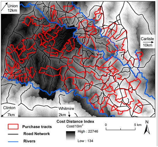 As a proxy for the effects of differential access to markets (central-place market forces) [7,20,47], we constructed a nearest market Cost-Distance Index (CDI). This index represents the geographically weighted cost of transporting farm products and materials to and from market. To construct the Cost-Distance Index we digitized the Purchase Era road network by adapting the existing road network to the 1933 aerial photo mosaic. We calculated cost-distance as the slope-weighted distance from a 10 m × 10 m node or “pickup” point on the road network to one of the nearest of four market towns surrounding the study area (Clinton, Whitmire, Union, and Carlisle) by following the least-cost road route from the pickup point to the market town. To account for differences in road quality, the roads were additionally weighted in two grades, primary = 1, secondary = 2. Primary roads were publicly-maintained highways that directly connected the market towns with each other and secondary roads linked farms to highways. We combined the road network-based cost-distance with a field-specific cost-distance analysis. The field-specific component calculated the slope weighted distance from a 10 m × 10 m area to its nearest pickup point along the road network. We combined both layers into an aggregated cost-distance index by adding the field-based cost-distance to the road network cost-distance for its assigned (nearest) pickup point (Figure 6). We then calculated the average cost-distance values for each land management unit to serve as covariates in the formal analyses.