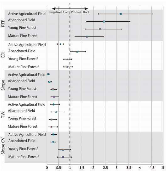 The Pseudo R2 for the M-Logit was 0.20 which indicates an acceptable fit for this type of model [51]. The relative risk ratios varied across the land use classes for each of the five independent variables. Analysis using the Relative Topographic Position indicator provided insight on the most probable location (uplands; ravines and side slopes; or bottom lands) of different land uses. The relative risk ratios for relative topographic position were significant and the strength of its effect varied across land use along a gradient consistent with studies of ecological succession in the Piedmont (Figure 7). The strongest, positive association is between agricultural fields and uplands. The gradient then follows to abandoned fields, young pine forest, and mature pine forests, each with a decrease in the strength of the relationship in comparison to baseline hardwood forests.