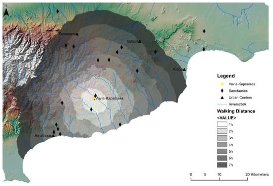 42]. One of the present authors has argued in print on several occasions that the distribution of these sanctuaries across the landscape served as a map for a socio-political system, which provided a mechanism for the centralized Archaic and Classical city-kingdom authorities to organize and control their peripheries. Environmental and Geographic Information System (GIS) analyses that were employed for the first time in the history of research on Cypriot sacred landscapes by UnSaLa and SeSaLaC, reinforced this argument about the territoriality of Iron Age Cypriot sanctuaries. Next to other archaeological evidence and GIS analyses that support the relation of the Vavla-Kapsales sanctuary with the polity of Amathous, for example, the results of Cost Surface Analysis, which calculates the walking distance between places, also strengthened this interpretation (