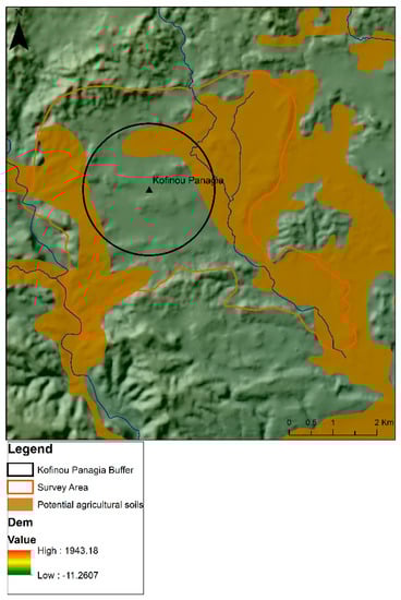 Figure 9). Interestingly, the Late Antique settlement itself lies in the middle of less fertile soils, a very wise choice on behalf of its inhabitants, making use of less productive areas for their settlement’s built space, as well as for less demanding cultivations, such as vegetable gardens and olive groves or as pasture land. More demanding crops, such as wheat and vines, would have been cultivated in the areas with the best soils, lying 800 m away from the settlement. Considering that approximately 300 families were living in Kofinou, and taking into account that 3.6 ha of land were required per family to meet their subsistence needs in pre-industrial times [