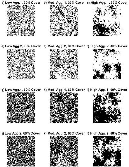 Our 1/f noise process enabled us to stochastically generate unique fuel map patterns that, for a given canopy cover level, only differed in the level of horizontal aggregation, controllable by a single parameter. Higher aggregation cases had larger coherent forest and open patches (Figure 2).