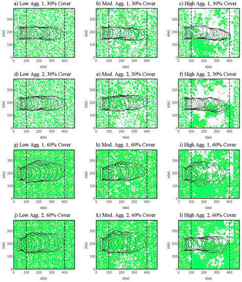 Interactions between fuel spatial patterns, winds, and fire influenced the timing and geometry of fire spread, illustrated for all fuel maps for the medium wind cases as contours (Figure 3). Differences in fire behavior between the 60% and 30% canopy cover cases are clear, particularly in lateral spread; qualitatively, contour shapes and sequence seem more regular when cover is high and aggregation is low, and larger scale aggregation seems to affect fire trajectories and result in more erratic spread (Figure 3).