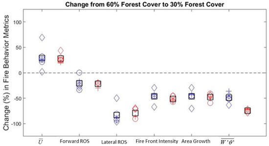 Figure 4. Changes in wind speeds and several fire behavior metrics, expressed as percent change between 60 and 30% canopy cover cases. Blue colors depict moderate wind cases while red depict high wind cases. Three spatial patterns are represented: low aggregation with a plus sign symbol, moderate aggregation with circles, and high aggregation as diamonds. For any plot column, mean percent change is shown with open bold outlined black squares.