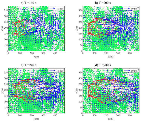 Figure 5. Overhead perspective showing the progression of a single fire, as red fire perimeter contours, in a spatially heterogeneous forest, at four different points in time (t = 160 s (a), 200 s (b), 240 s (c), and 280 s (d)). Blue arrows indicate wind field direction and magnitude (longer arrows indicate higher local wind speeds), at a height of 9.6 m above the ground. This figure illustrates complex and dynamic interactions between the wind field, the canopy, and the fire over time. Winds coming into the fire at the fire front are typically convective in-drafts.