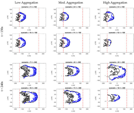 Figure 6. Fire progressions for high canopy cover, medium wind cases, at two points in time, t = 150 s (top two rows) and t = 240 s (bottom two rows). Black lines show contours of active surface fire while blue lines show concurrent contours of active fire in the canopy.