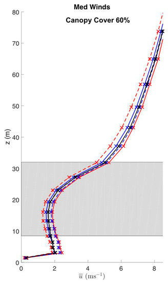 Figure 7. Spatially and temporally averaged vertical profiles characterizing streamwise (forward) wind flow velocity, U ¯ , on the x axis, with increasing height on the y axis. Lines with X’s represent 60% cover cases while lines without X’s represent 30% cover cases. Red lines show profiles for high aggregation cases, blue lines show moderate aggregation cases and black lines show low aggregation cases. The spread of profile lines of similar colors illustrates differences in winds arising from interactions between fuel spatial patterns, ambient winds, and the fire; differences between replicates are highest for high aggregation cases. The gray area indicates the vertical range within which the canopy is found.