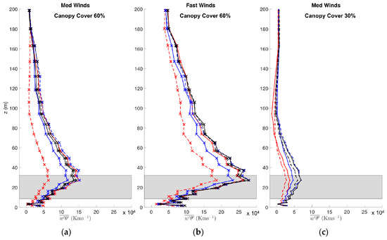 Figure 8. Spatially and temporally averaged vertical profiles characterizing the kinematic heat flux, W θ ¯ , (on the x axis) with increasing height (y axis), for (a) 60% canopy cover, medium winds cases, (b) 60% canopy cover, fast winds cases, and (c) 30% canopy cover, medium winds cases. Red lines show profiles for high aggregation cases, blue lines show moderate aggregation cases, and black lines show low aggregation cases. All three plots share the same x and y axes. The spread between profile line pairs (same color) illustrates differences between spatial replicates. Across all three subplots differences are highest for the high aggregation cases (red lines); differences are most pronounced for medium wind, high canopy cover cases (a) fuel spatial patterns; differences between replicates are highest for high aggregation cases.
