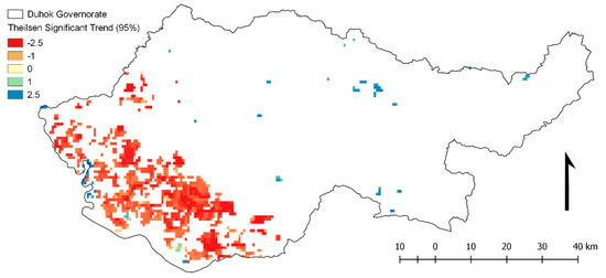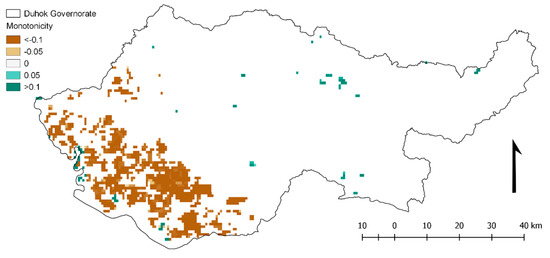 Areas defined as “arable land” amounted to 1550 km2, which represents 24% of Duhok governorate (Figure 4). Between 2011 and 2014, 1140 km2 of land were classified as active, leaving 410 km2 that had previously been used for cereal cultivation, but had changed land use or became fallow. Much of the fallow land is located around the urban areas of Duhok and Zakho, which suggests that these lands are part of an urban expansion process (Figure 4). A significant negative trend in vegetation productivity is evident in areas classified as winter cropland (Figure 5), indicating land degradation and reduction of productivity in these areas. A few areas exhibiting positive trends in vegetation productivity are found in mountainous areas where the dominant land cover is woodland and grassland. The monotonicity of the Mann-Kendall trend shows the extent to which the trend has been steadily decreasing (negative values) or increasing (positive values). The values in cropland areas show a moderate monotonicity, indicating that there are some fluctuations between different years, but that the overall trend in vegetation productivity is negative (Figure 6). Between 2000 and 2013 the average vegetation productivity fluctuated strongly in cropland areas and followed a similar temporal pattern as the precipitation (Figure 7). Croplands show an overall negative trend in productivity, while non-cropland areas show a stable trajectory. The drop in vegetation productivity in 2008 coincides with a documented meteorological drought [35], but non-cropland areas did not exhibit the same drastic change in productivity.
