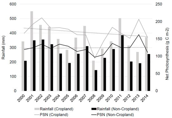 Growing season net photosynthesis (PSN) and rainfall trends in cropland and non-cropland areas between 2000 and 2013.