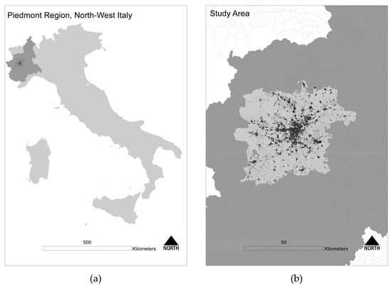 The context of study. (a) The location of the Piedmont region in Italy and (b) the context of study (in lighter grey, the catchment area).