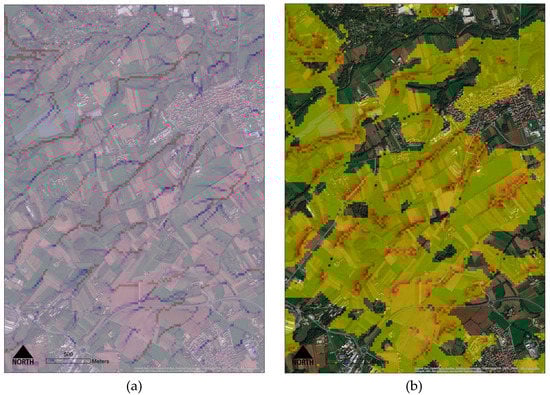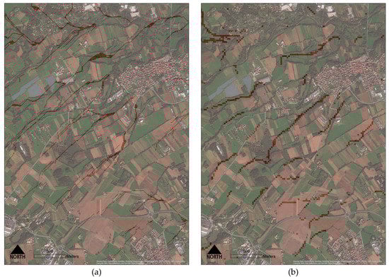 Correspondence between model streams and the real water bodies. In the left image (a), the runoff model generates streams that are poorly correspondent to the existing watershed (DEM 10 m) while, on the right (b), the model generates streams fairly correspondent to the existing watershed (DEM 25 m).